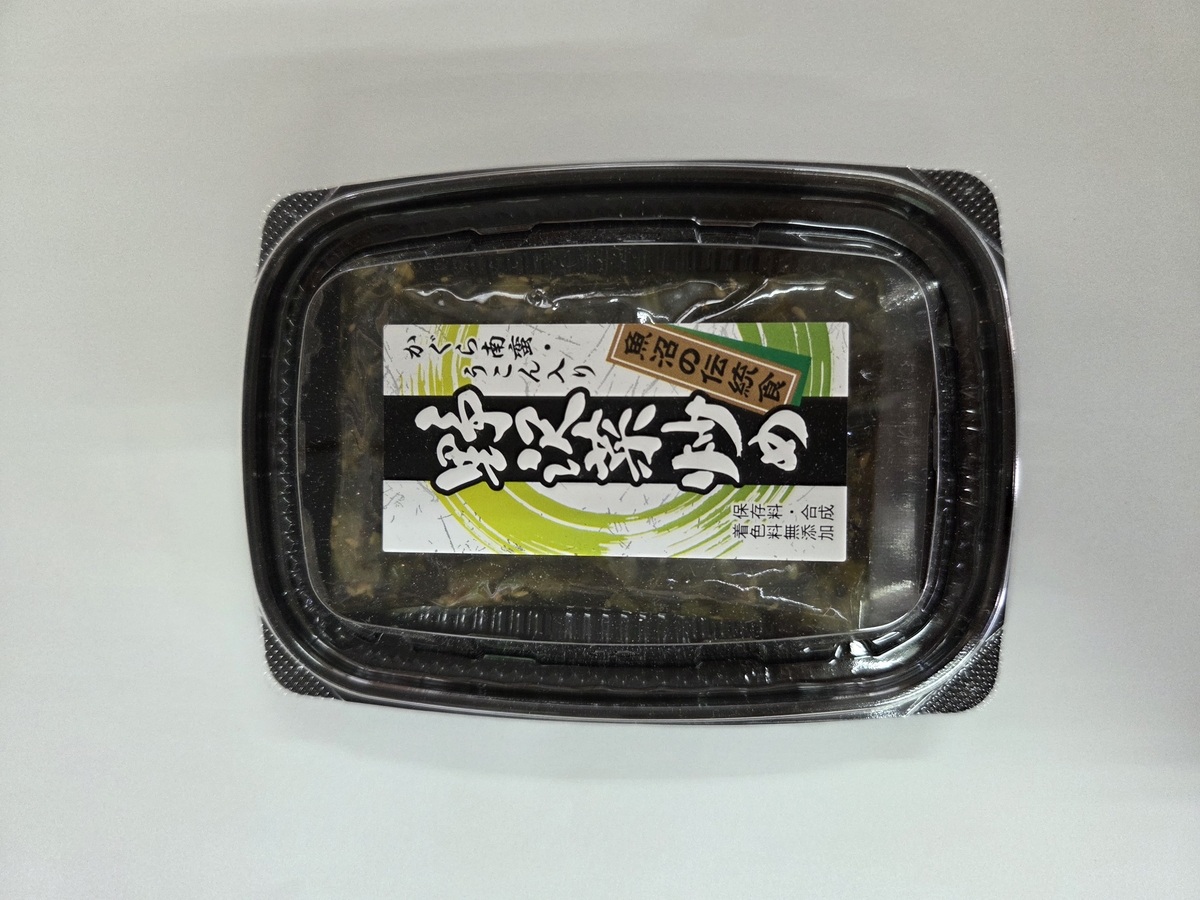 野沢菜、ごま油、醤油、かぐら南蛮、鰹節エキス、砂糖、みりん、ごま、昆布エキス、食塩、うこんパウダー、酸味料、調味料(アミノ酸など)、原材料の一部に小麦、大豆を含みます。